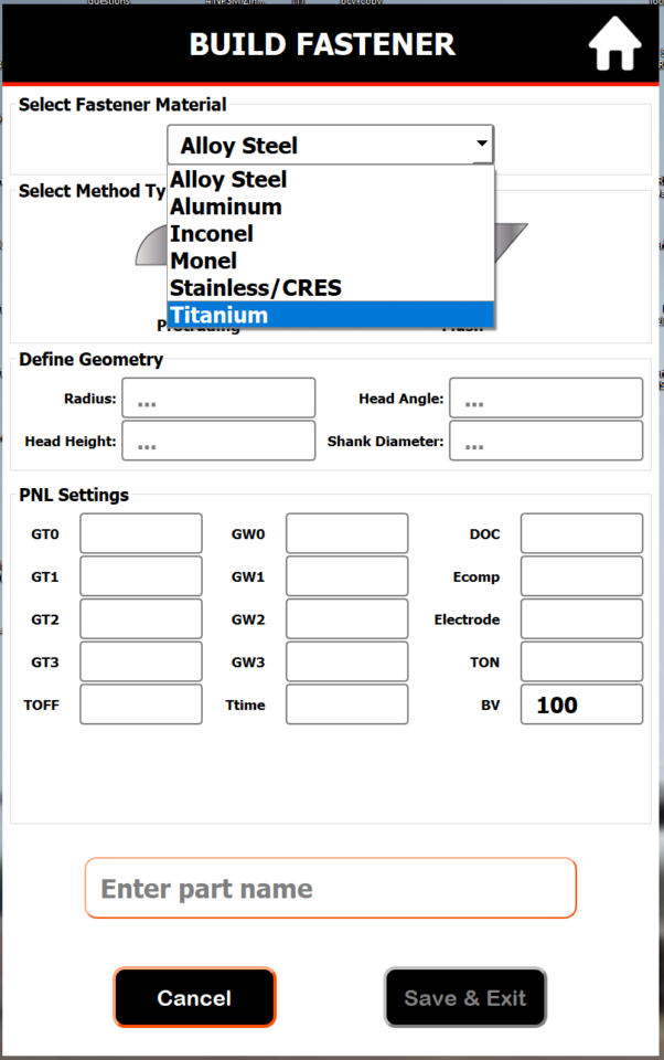 Select the fastener material from the drop-down list. The standard available materials include Alloy Steel, Aluminum, Inconel, Monel, Stainless/CRES, and Titanium. If the fastener material you need to cut is not listed, please contact PPEM support, as this is a special case application.