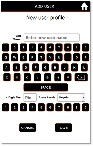 To create a new user profile, press Add User, enter the user’s name, input a 4-digit pin, and select the type of access this user will have (regular or advanced). Regular users will not have the ability to edit pre-existing fasteners, add/remove users, and execute some of the advanced and admin level advanced features. To delete a user profile, press Del User and the user profile you wish you remove