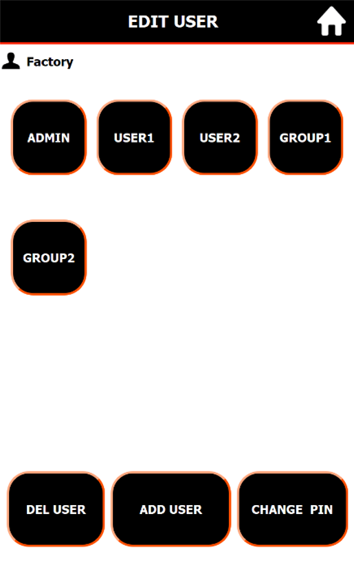 To navigate to the user profile screen, select User from the main menu and then Edit from the User menu. From the user profile screen, users can be added or deleted and the Admin user pin can be changed seen in the Edit User screen. To change users, select Logout, and log in using a different user profile.