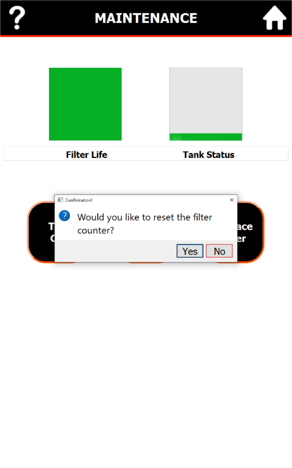 After filter or DI filter cartridge replacement, the system must be completely filled and bled. Follow section 9 for recharge and bleed procedure. The system will prompt to confirm that you are resetting the filter count, select “YES.”